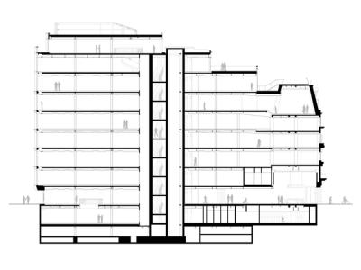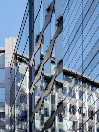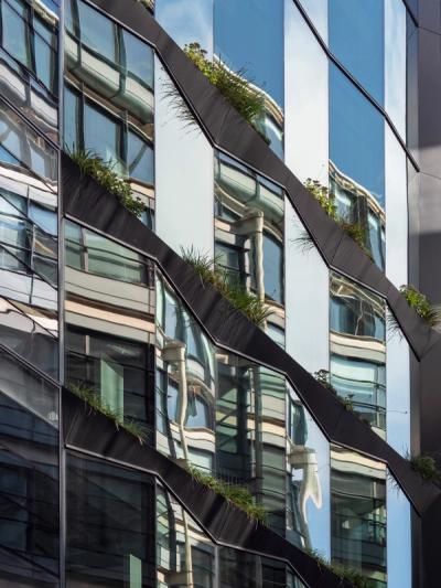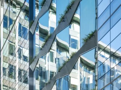 We were also able to retain 74% of the 1990s double-glazed unitised cladding, reconditioning it where possible and adding identical new components where needed – for example in areas where the inside surface had been sprayed grey. We gave the outer wall of the former atrium a zigzag infill: a calm intervention which also allowed us to incorporate some greenery into the façade.