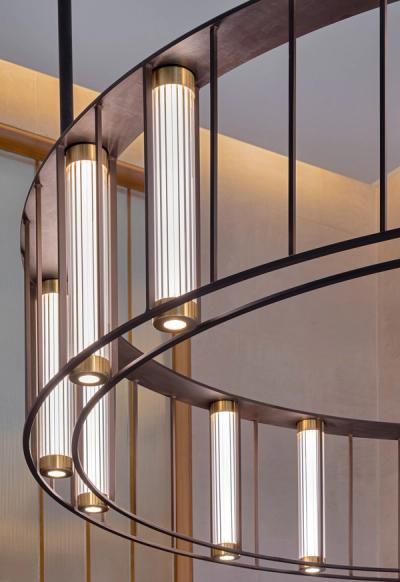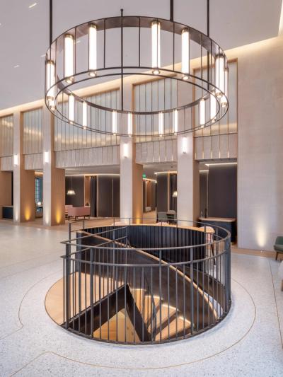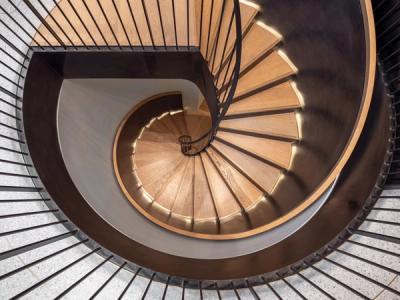 With the atrium infilled, the main reception is now in the older part of the building behind the restored Edwardian Baroque facade. Visitors are drawn through the double-height space, the repositioned lift core extending the entry sequence. We wanted to achieve the same sense of volume, clarity and elegance found in railway-station halls and hotel lobbies so all the elements have simple geometry: a helical stair, a circular drum door and a square reception desk.